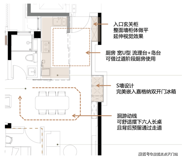 一进门,移门可全部推开的开放式厨房就进入视野,而 本次全新升级的岛台就在厨房延伸出去的端头。开放式厨房采用宽U型设计,开口方向正好可以将入户走道利用起来,扩大实际使用中厨师的活动范围。