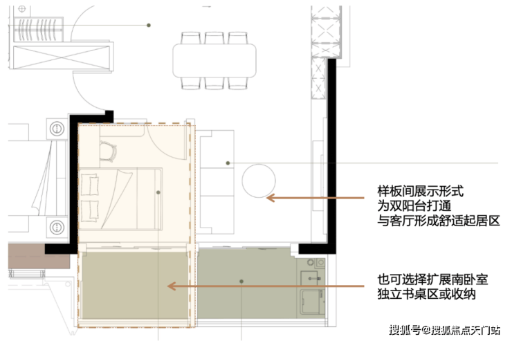 也可以将两个阳台分别视作不同空间的延伸,客厅这边,从厨房开始的LDKG一体化空间开放自由,南卧室则扩展房间面积,无论是补充孩子独立书桌,还是独立兴趣空间,都能提升卧室品质。