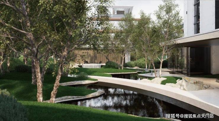 在社区内部,则通过一条自然水轴,串联六大景观节点,从约35米宽的酒店级社区大门,到内部水院以及不同主题的景观花园,步步皆景。