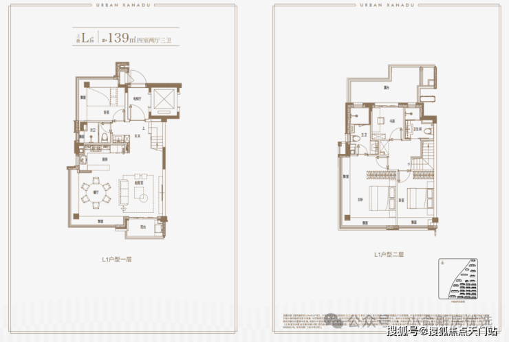 建面约139㎡上叠户型,三层是会客区,四层是居住区,阳台+露台+多个飘窗设计,附加空间非常大,在别墅类产品中实属罕见!