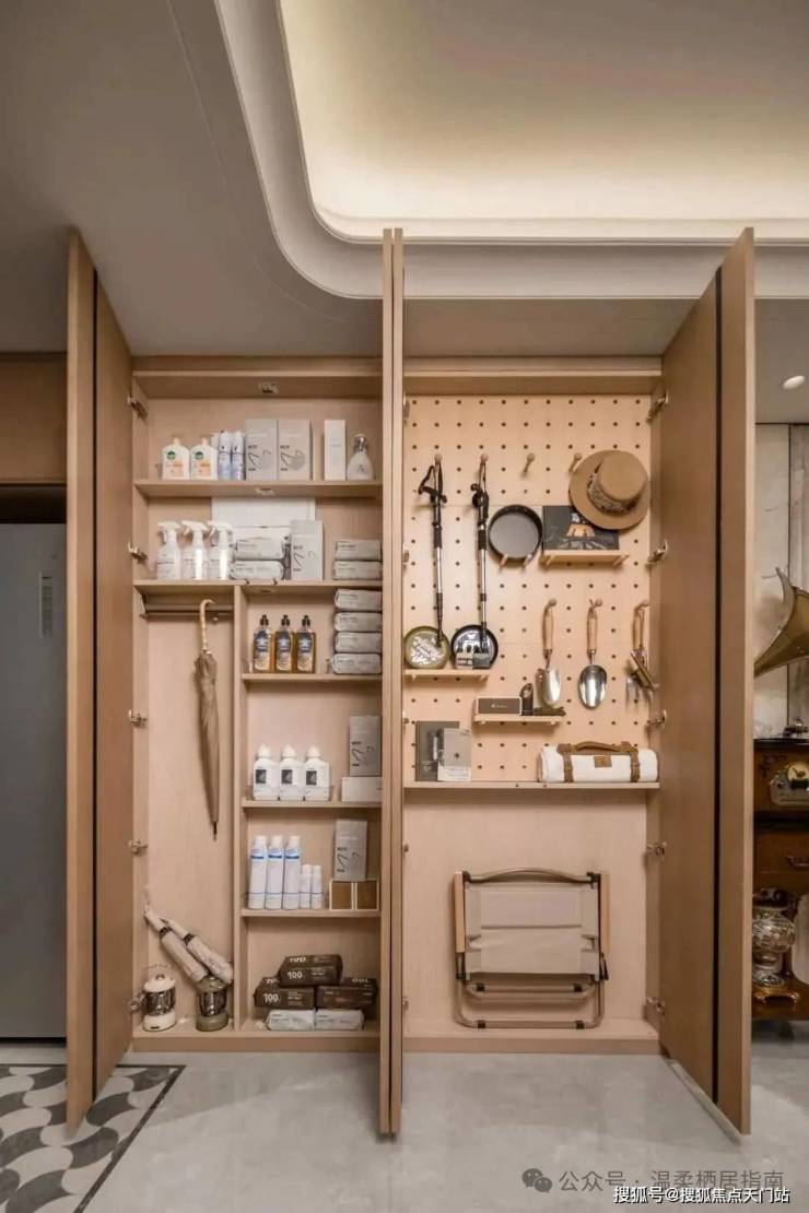 双薄柜设计则大大增加容纳空间,举例来讲,可容纳约200包纸巾,足以满足全家1年使用。而洞洞板设计,则可收纳清洁工具、长柄伞等大件日常用品,如此贴心布局,保证室内物品足够井然有序,也更为利于家庭日常打扫。
