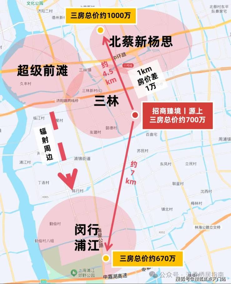 而招商臻境建面约105㎡三房主力总价约700万级,部分房源总价约650万级,相比之下,北面直线距离约4.5km的北蔡新杨思,板块在售新房单价陆续超10万+/㎡,想买三房预算需破千万,每隔1km房价就几乎相差1万。