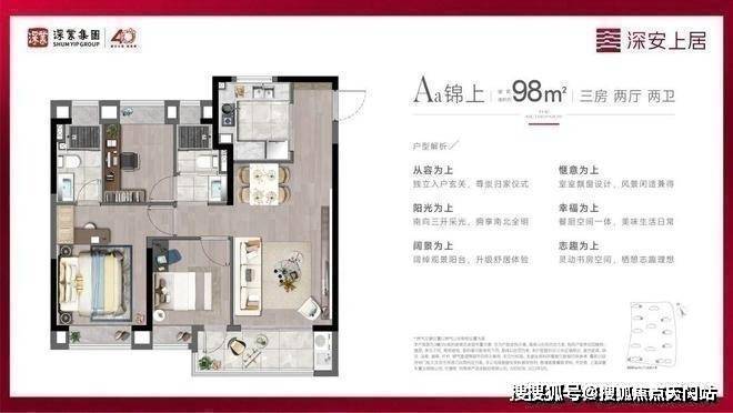 客厅一路 连通到超大阳台。赠送飘窗空间。深业·深安上居建面约98㎡户型主次卫均 设有飘窗,从细节处彰显人性化的关怀,让沐浴空间的舒适升级。深业是利 用更多“灵活空间”和“灵活设计”。88平样板房实景图