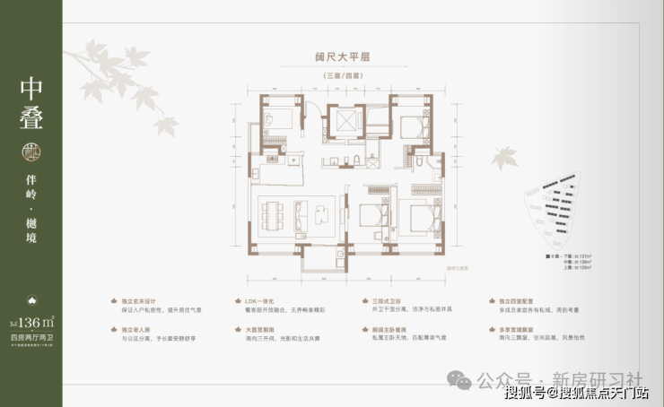 建面约137㎡下叠,四房两厅三卫全能格局,非常适合二娃家庭以及三代同堂。