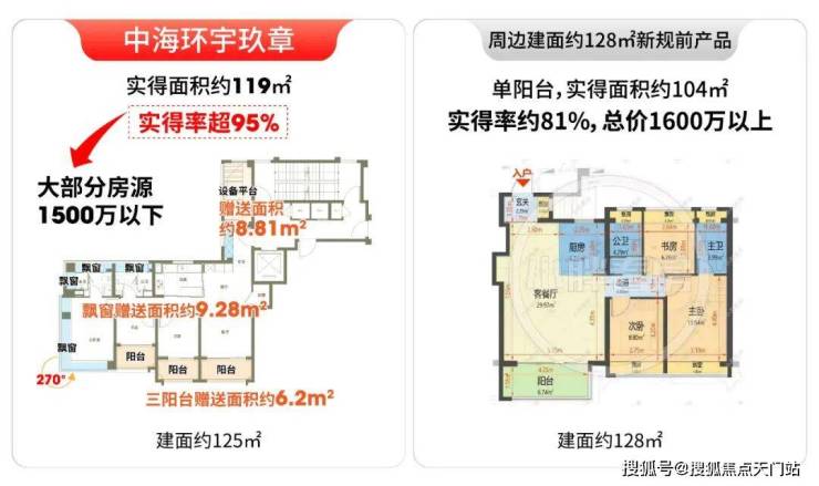 环宇玖章125户型实得率超95%,而宝华项目实得率仅约80%。按同等实用面积折算,环宇玖章实际单价就更划算,仅约10万/㎡。