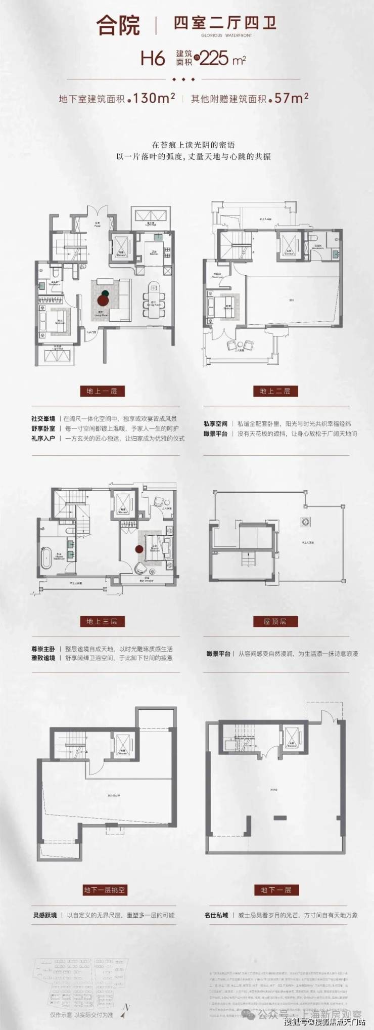 合院:建面约190㎡三室两厅三卫、约210-230㎡四室两厅三卫/四卫,附赠地下室+露台,总价预计约2000万;3层地上+地下室设计。