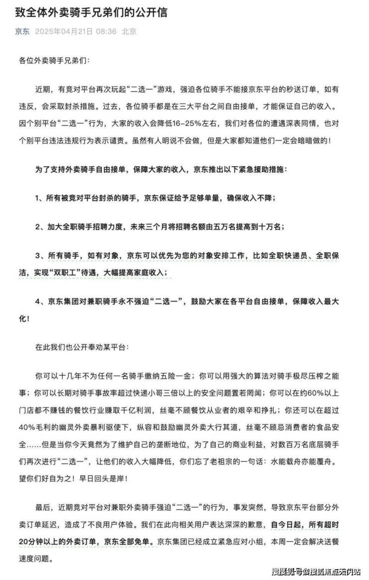 4月21日,京东集团发布公开信称,为了支持外卖骑手自由接单,保障大家的收入,京东推出以下紧急援助措施: