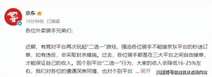 此外,京东还表示,近期竞对平台对兼职外卖骑手强迫“二选一”的行为,事发突然,导致京东平台部分外卖订单延迟,造成了不良用户体验。我们在此向相关用户表达深深的歉意,自今日起,所有超时20分钟以上的外卖订单,京东全部免单。京东集团已经成立紧急应对小组,本周一定会解决送餐速度问题。
