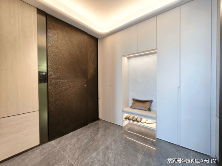 类一梯一户的设计, 门口带有一个巨大的电梯厅空间,业主可以利用成为收纳空间。入户后,是一个 独立玄关+800库 设计,让业主 常用物品(洗衣机、清洁工具等)有了绝佳的放置位置。