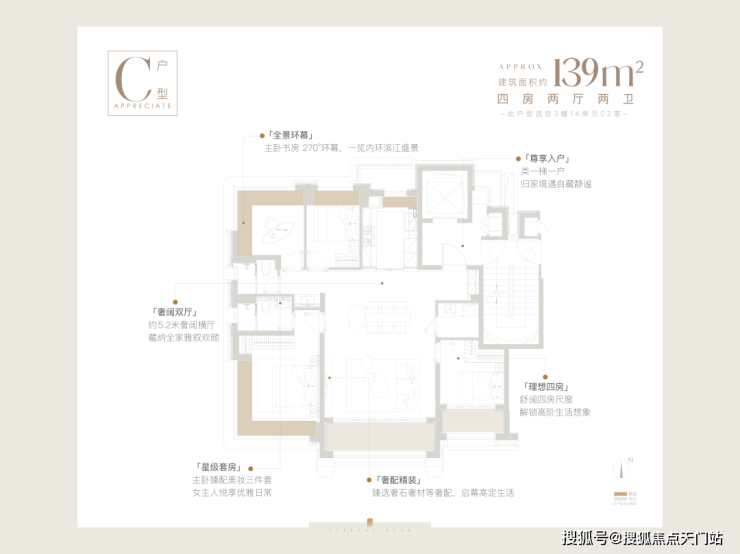建面约139㎡户型,定制规格全面升级,玄关+背景墙由岩板升级为奢石,芬迪白、万象山河、海蓝之谜三选一,天然肌理自带传世质感,每一寸都彰显高端格调。地板升级为百亿豪宅世博天悦同款造型,更匠心融入嵌铜工艺,质感再升阶,颜色可在深浅两色中甄选,花纹更有三种款式可选。