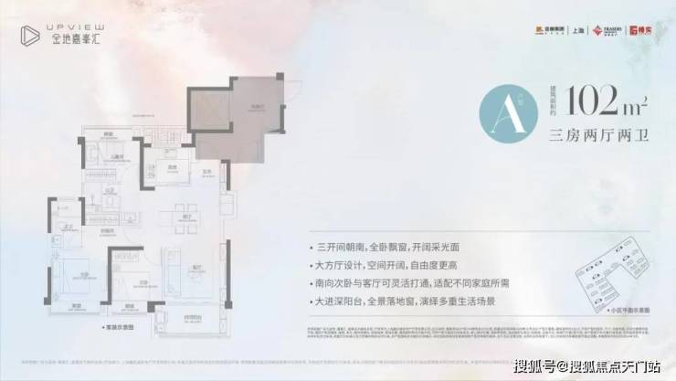 A户型是建面约102㎡3房2厅2卫,该户型 三开间朝南 采光效果上佳。 大方厅设计 ,空间开阔自由度更高。南向次卧和客厅可灵活打通,适配不同家庭所需; 大进深阳台+全景落地窗 ,让室内的通透性和视野可圈可点。