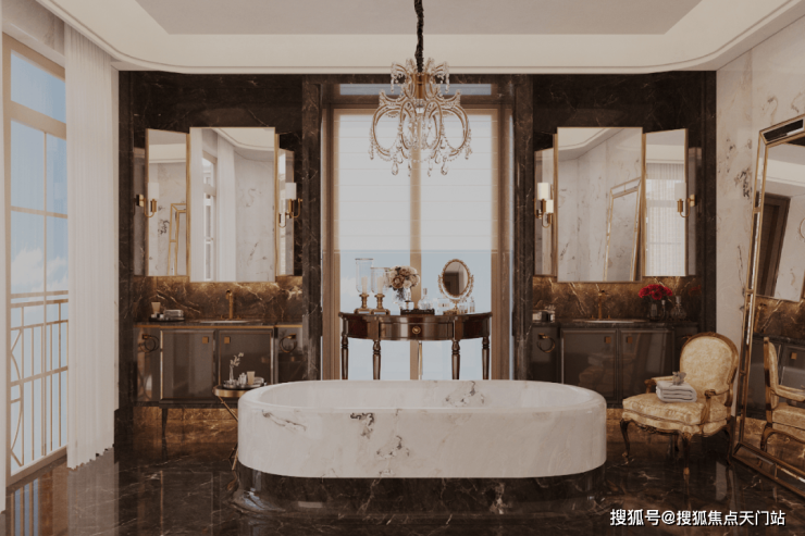 秩序,是主卫浴空间布局的重点。两个独立台盆相对而立,分属男女主人,营造出从容自如的使用体验。大面积运用黑白撞色大理石,让空间的秩序美与材质的自然美融合,颇具观赏韵味。