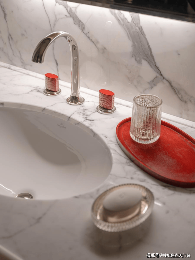 一抹亮色,从素雅的卫浴空间跳脱而出。来自白宫御用品牌Kallista(卡莉斯塔)的龙头套装,专为天潼198项目定制复古陶瓷红,华丽而传统的色泽,呼应着项目的红砖风貌。