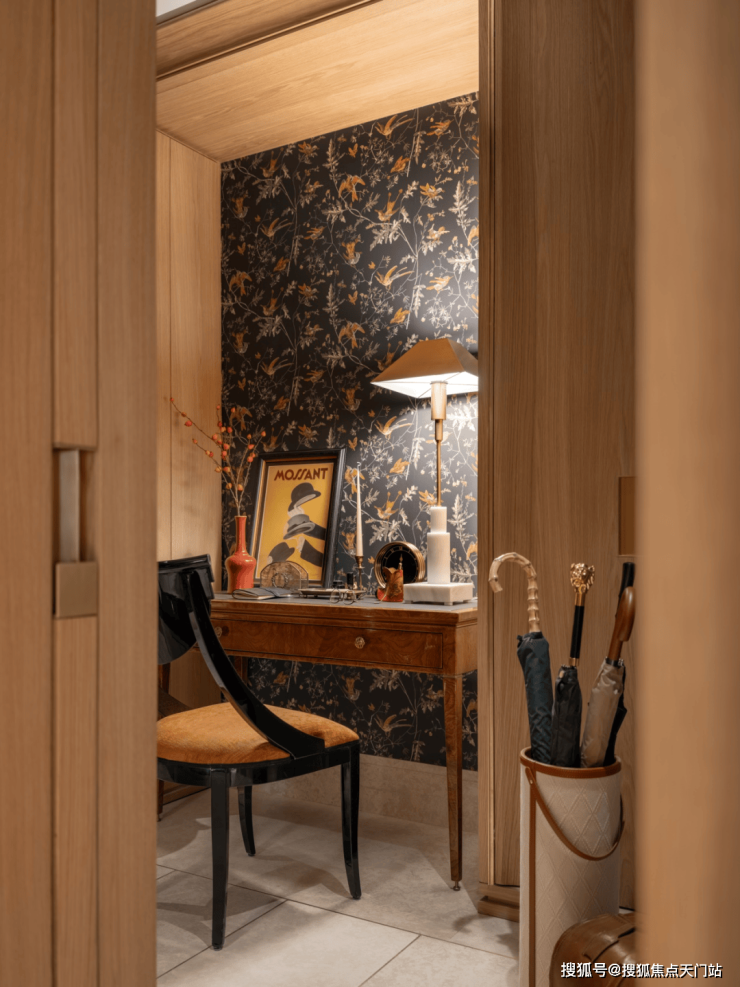 玄关具有变化性与功能多重性,壁纸融合中西方色彩和纹样,除了更衣功能,更摆放了古董书写桌,以手写文字传递信息,传递慢节奏生活方式,丰富空间的装饰和功能,目光所及视角变得丰富。