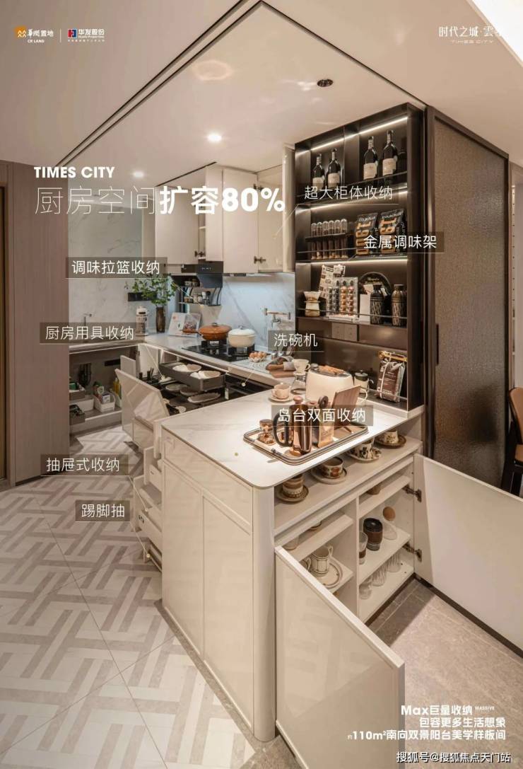 其 全屋收纳系统尤为突出!U型厨房采用半开放式设计,“分层调味架、下拉篮及踢脚抽”实现高效收纳;