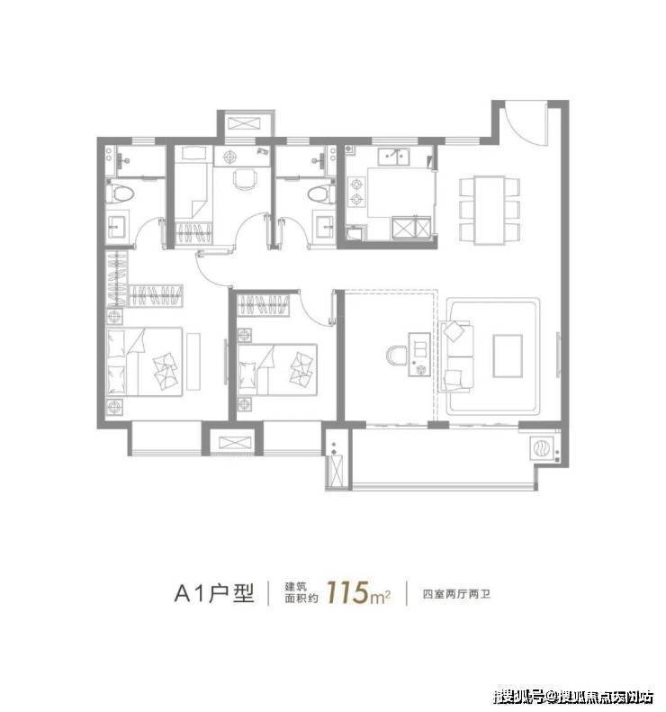 建面约115㎡的4房2厅2卫户型,超大面宽南向阳台、整体南北通透、主卧套房的设计,这个户型实现了多数人对于未来生活的期待。