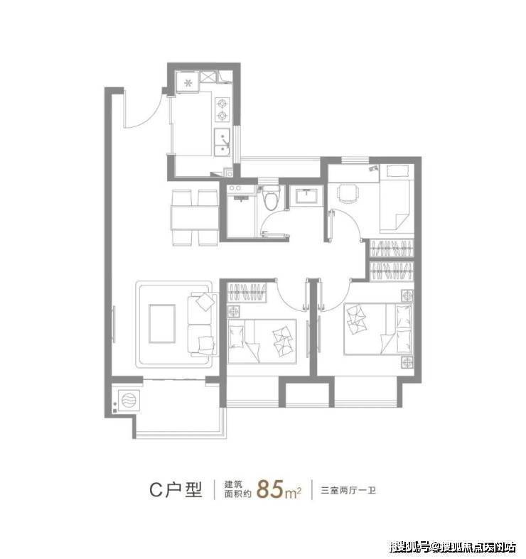 建面约95㎡的3房2厅2卫户型,可以说是刚需置业一步到位的户型,从二人世界到二胎家庭的全生命周期需求都能满足。