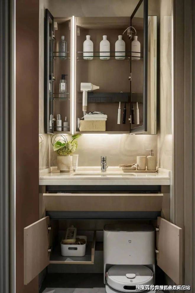 卫生间镜柜与预留洗地机位的台下柜,方便清洁用品的收纳,创造独立的家政清洁收纳空间。内嵌LED灯带的防雾镜柜,方便沐浴后的护理与美肤。