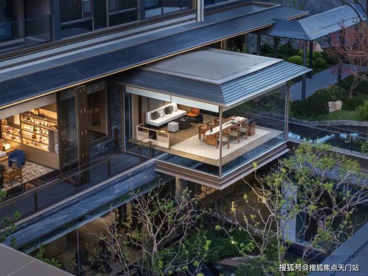 三面悬挑的玻璃结构,凌空架在水景之上。静坐其间,松风拂面,目光 穿过通透的玻璃,便能看见层层庭院的绿意与水韵 。喝茶,不只是喝茶,而是一次与天地对话的体验。