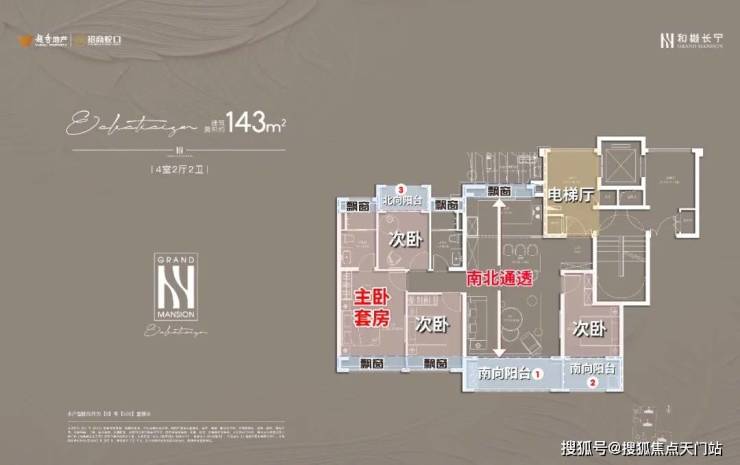 项目建面约143㎡户型的设计无疑是市场一流水准,一梯一户保证私密性和尊崇感;四开间朝南+大宽厅,采光效果爆棚;主卧贯穿南北套房设计,南北都有飘窗,舒适度可圈可点。