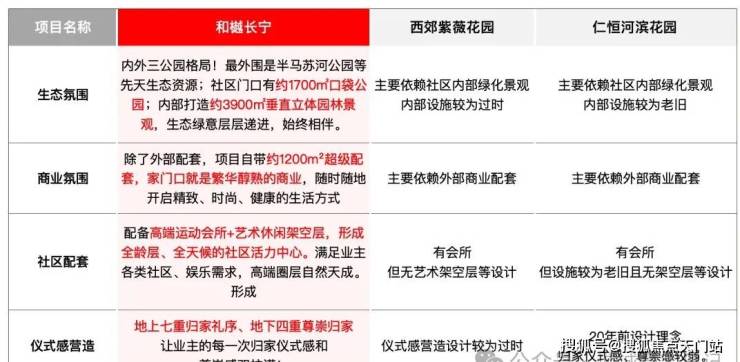和樾长宁的迭代首先是公区发力,我们可以对比下同板块3个关注度较高小区:和樾长宁、西郊紫薇花园、仁恒河滨花园(最新挂牌价也有12万+)的公区配置。