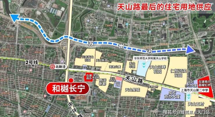 其他区域肯定会,但和樾长宁没有对手,理由很简单:项目是长宁内中环十年难遇的新房供应,也是天山路最后一块宅地。天山路有2号线串联,又邻近苏州河,环境非常宜居,沿线早就“塞满”了高端住宅小区,上一个入市的新房还要追溯到西郊紫薇花园。
