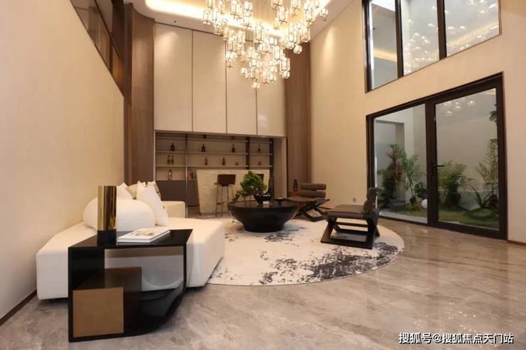 通过优化后的“L型”空间排布,实现了三面有园林环绕,前庭空间尺度非常大,一进门就是约10.2米的大横厅,气派十足,采光也做到极致,日常起居极为从容舒适。