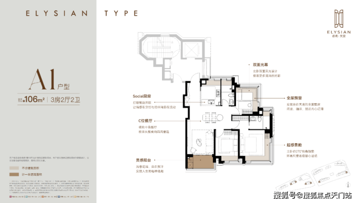 其中, 建面约106㎡户型主卧飘窗为约270°转角飘窗!