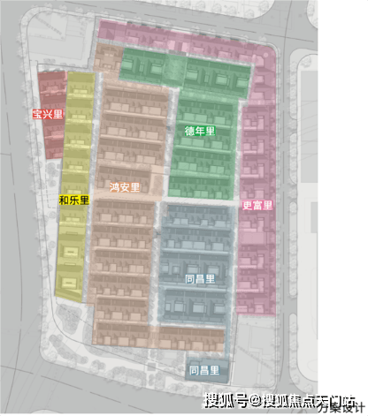 弘安里这块地原由8个街坊组成,其中东寿坊和永安里因后期加建改建较大,体量也很小,为了园区整体考虑,不再保留,延续了剩余6个组团:德年里、和乐里、宝兴里、更富里和鸿安里。