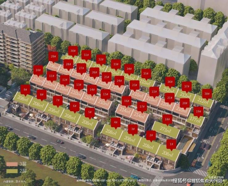 别墅区从南至北规划设计为四排错落又整齐的楼栋。最南侧和最北侧为两层建筑;中间两排主要为三层、东端也为二层。