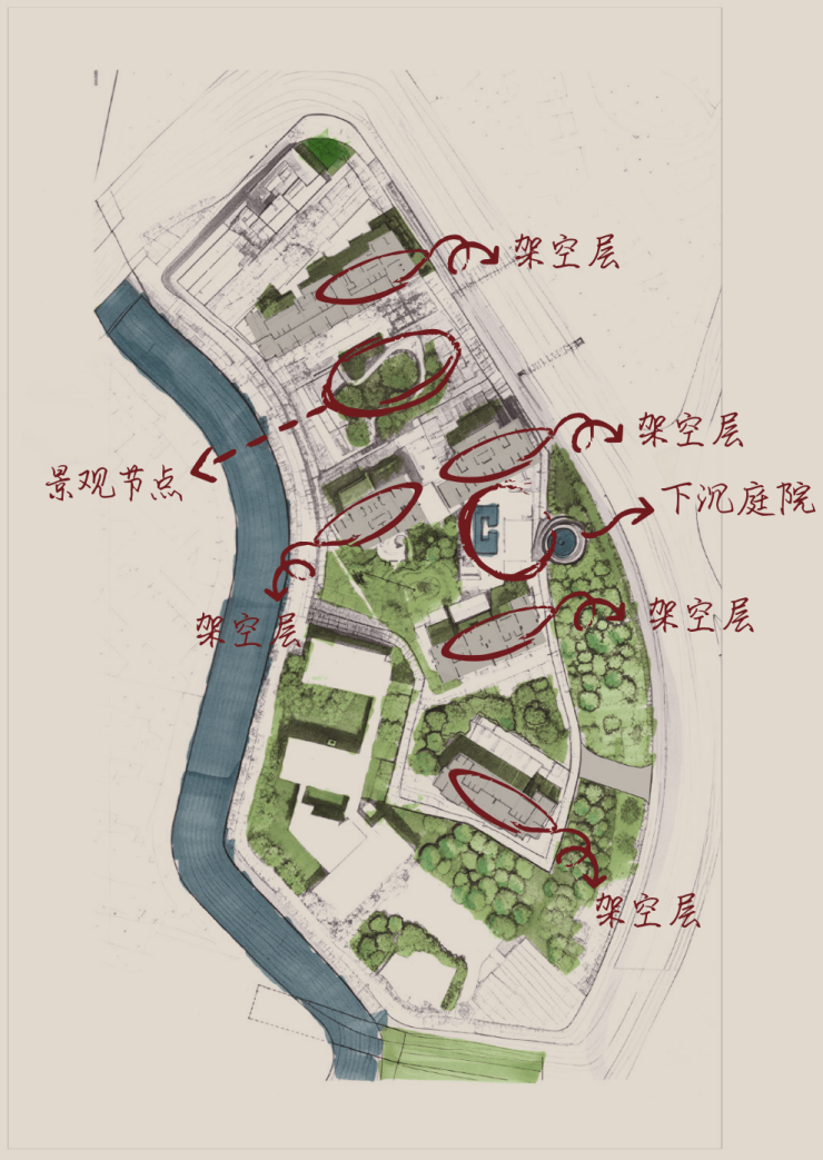 超高的架空层,将社区内核心景观视野,尽收眼底,不断洄游且连续的漫步动线,视觉形成了连续的感官通廊,视觉和路径上,对于景物的情感,连续不断,且移步异景。