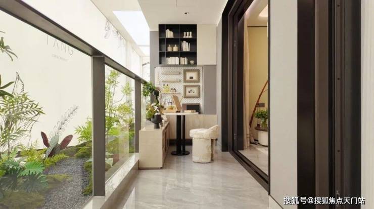 沉浸式下沉式庭院空间以水为墨,营造出了具有流动艺术氛围的自然空间,水幕墙、叠水水景、植物相互交融渗透,带给业主东南亚度假酒店般的松弛感。