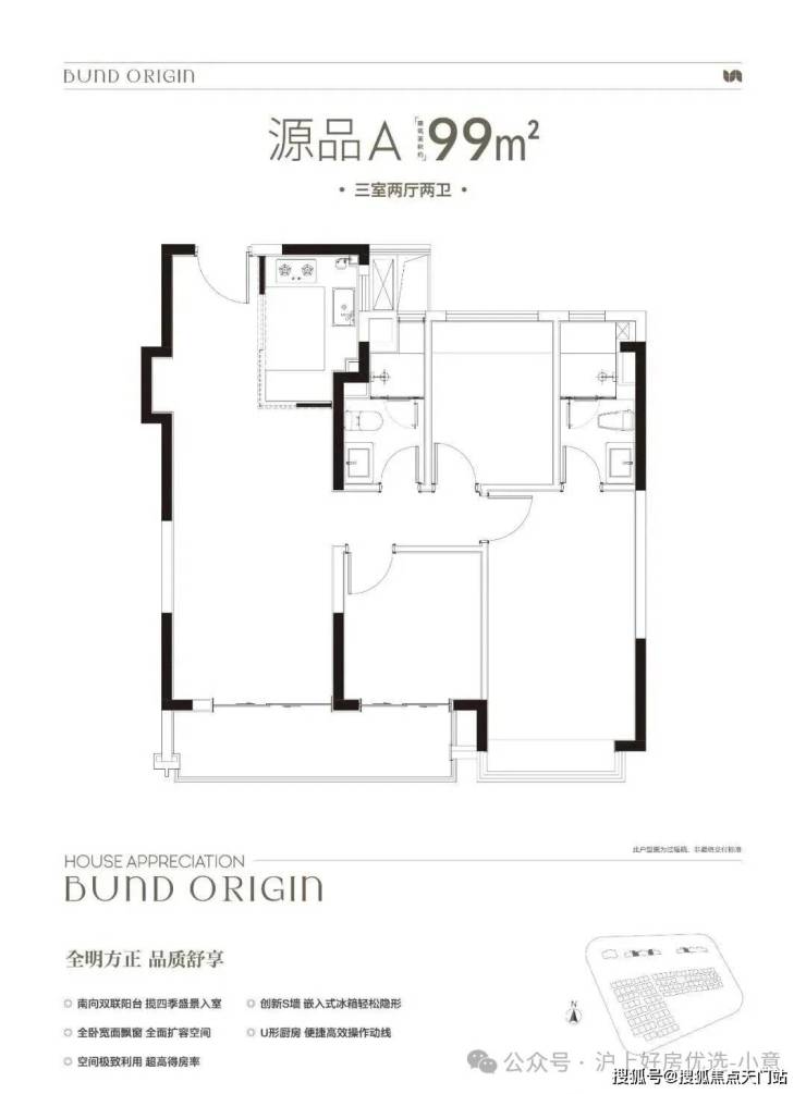 建面约99㎡3房2厅2卫,非常标准的动静分离、三开间朝南户型。