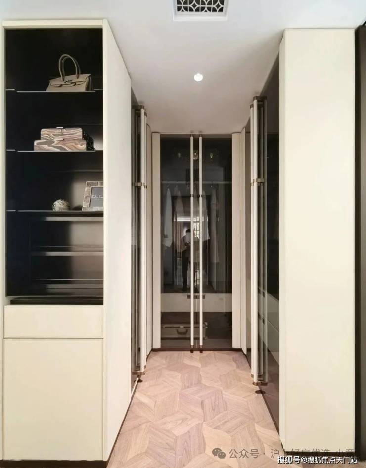 主卧和约99平户型一样,衣柜更大形成衣帽空间,还交付有半开放式、类似于酒店的迷你吧设计: