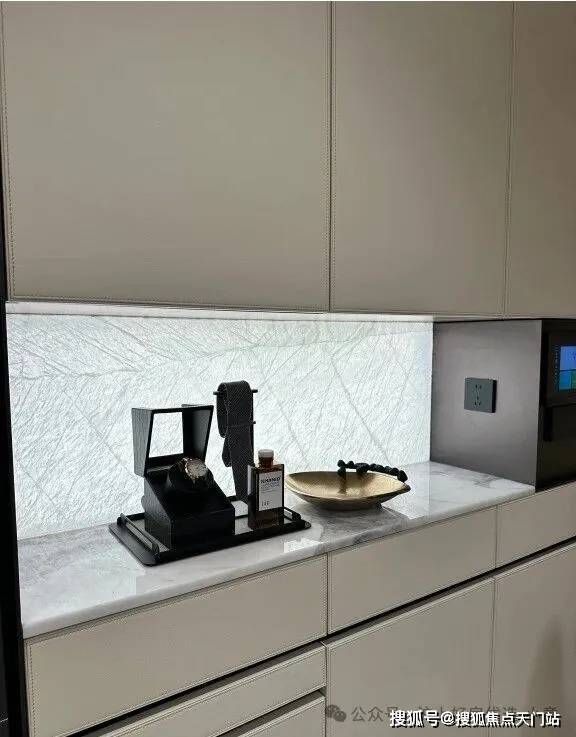 进到实地约99平样板房,整个玄关柜几乎全部都是皮质缝线包裹,细节拉满;