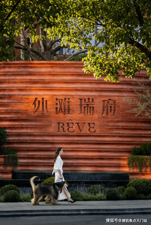 在精神标识上,“外滩瑞府”与“RÊVE”标识更是直接在红洞石上切空的双层设计,内嵌灯带,白天呈现石材本身的纯粹质感,夜晚则虚实相生、光影流转,格调十足;镜面水景倒映着建筑轮廓与城市灯火,让材质的高级感在自然与人文之间流转。这种红线内外一致的材质表达,不仅让外滩瑞府有了鲜明的识别度,更让这份独特性成为外滩之上独有的视觉符号。