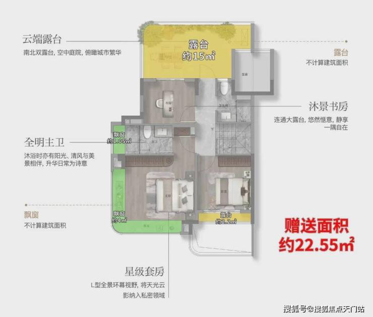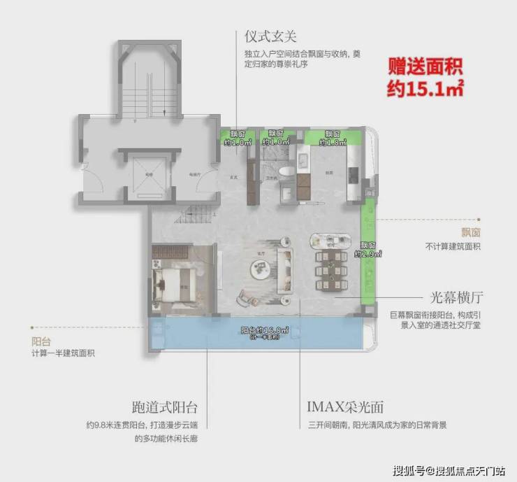 这个户型有约9.8㎡的飘窗,约7.2㎡的阳台,整体的附赠高达约13.4㎡。这是目前上海外环沿线,是附赠率最高的一个小高层产品。