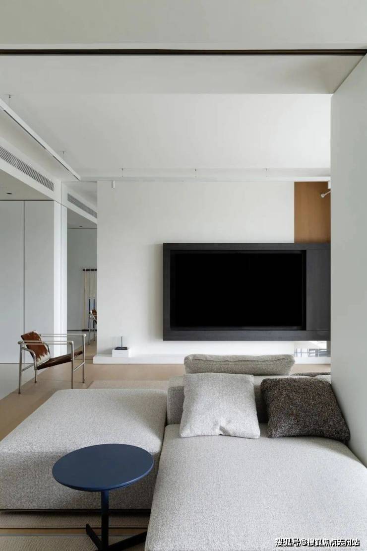 书柜和灰色涂料的立面处理形成了空间的视觉延续性,打破了传统界面的固有局限。电视柜悬浮式的留白设计与终端镜面反射的布局,在虚实之间创造出空间的无限延展可能。
