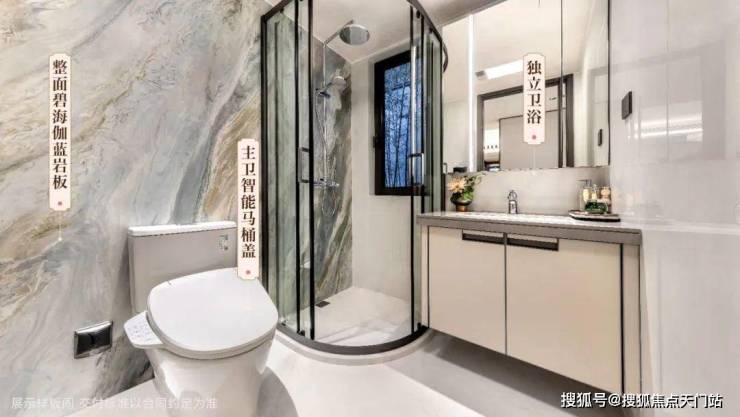 主卧预留衣柜空间,明亮观景飘窗,既能够节省空间,又能提高使用效率。独立卫浴,智能马桶盖,搭配整面碧海伽蓝岩板,色彩高级,且富有艺术感,方寸之间,尽赋日常优雅时光。