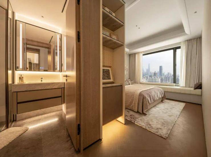完整套房格局,背景墙、衣柜均为高标准交付;全景落地飘窗视野无界,内部无遮挡结构让空间感更显奢阔。独立卫浴与专属衣帽间一应俱全,宜居、舒适、私密、奢华全方位拉满,成就主人专属的静谧奢享天地。
