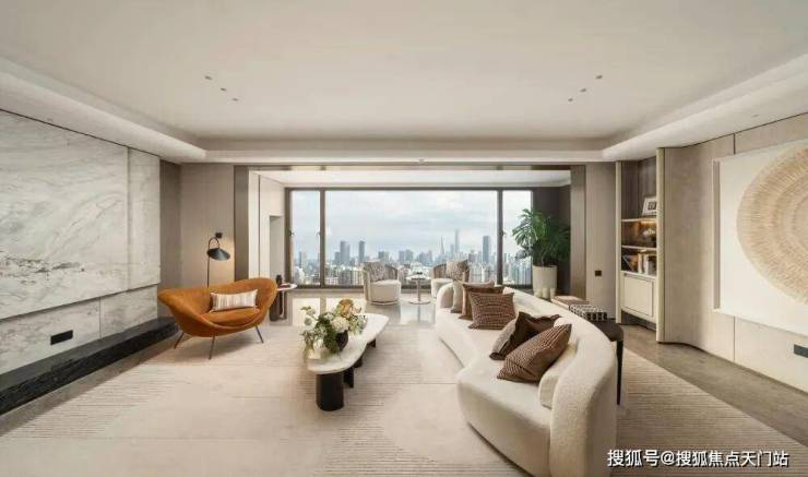 步入客厅,南向超大面宽带来豁然开朗的视野,搭配开放式厨房,LDK 一体化公区气场堪比不少 180㎡以上户型。客厅与超1.8米进深阳台通铺设计,进一步延展空间感,通透大气。客厅背景墙采用弧形奢石工艺,成本不菲却质感卓绝。