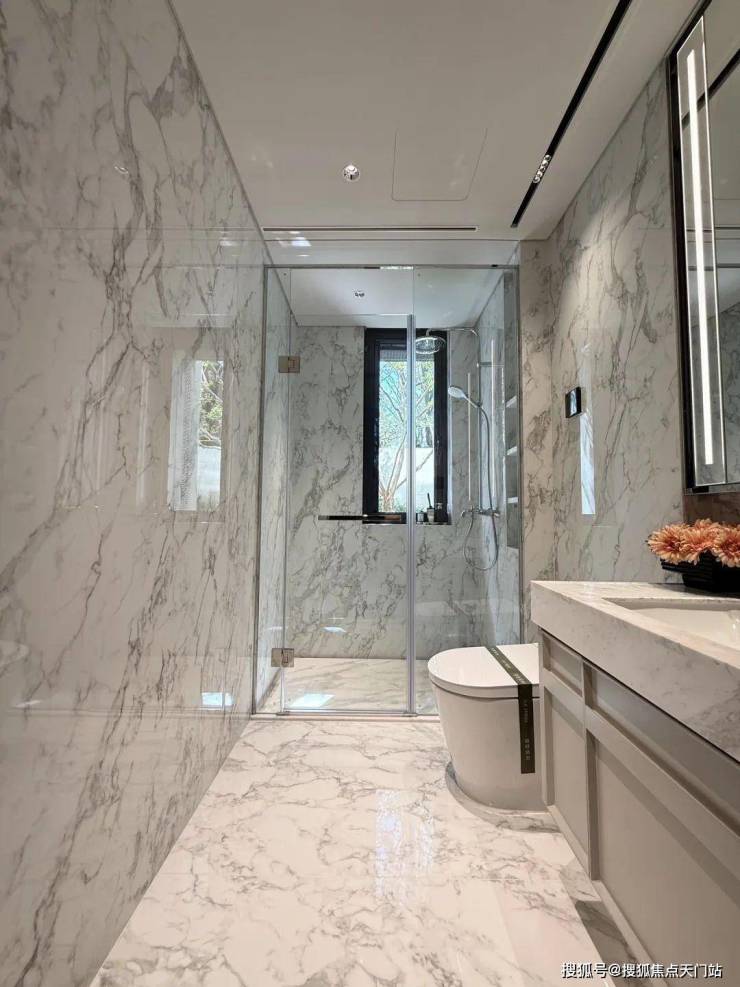 收纳细节上,二期户型中完美继承了一期的收纳系统,玄关收纳,整面内嵌柜体一直延伸到餐边柜;厨房全屋定制的柜体;卫浴的镜面柜和美妆冰箱等等,主卧卫生间的进一步升级:洗手台与化妆台相对,拥有三面镜柜,视觉空间进一步扩展和延伸。