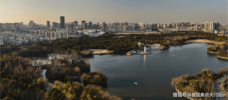 落日时可挽着爱人,一边漫步湖畔遛娃遛狗,一边看天边余霞成绮,湖中碎光点点,人与自然融为一体。