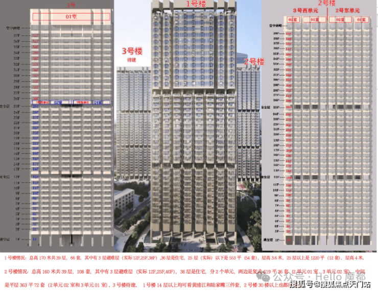 2号楼情况:总高160米共39层,108套,其中有3层避难层(实际12F,25F,40F),36层是住宅,分2个单元,两边是复式619平36套(2单元01室、3单元02室),中间是平层363平72套(2单元02室和3单元01室)。3号楼待建。1号楼14层以上均可看黄浦江和陆家嘴三件套,2号楼30楼以上也都能看到。
