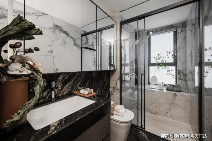 卫浴墙面采用 寒江雪大瓷砖铺装,淋浴部分 地面选用整块天然大理石