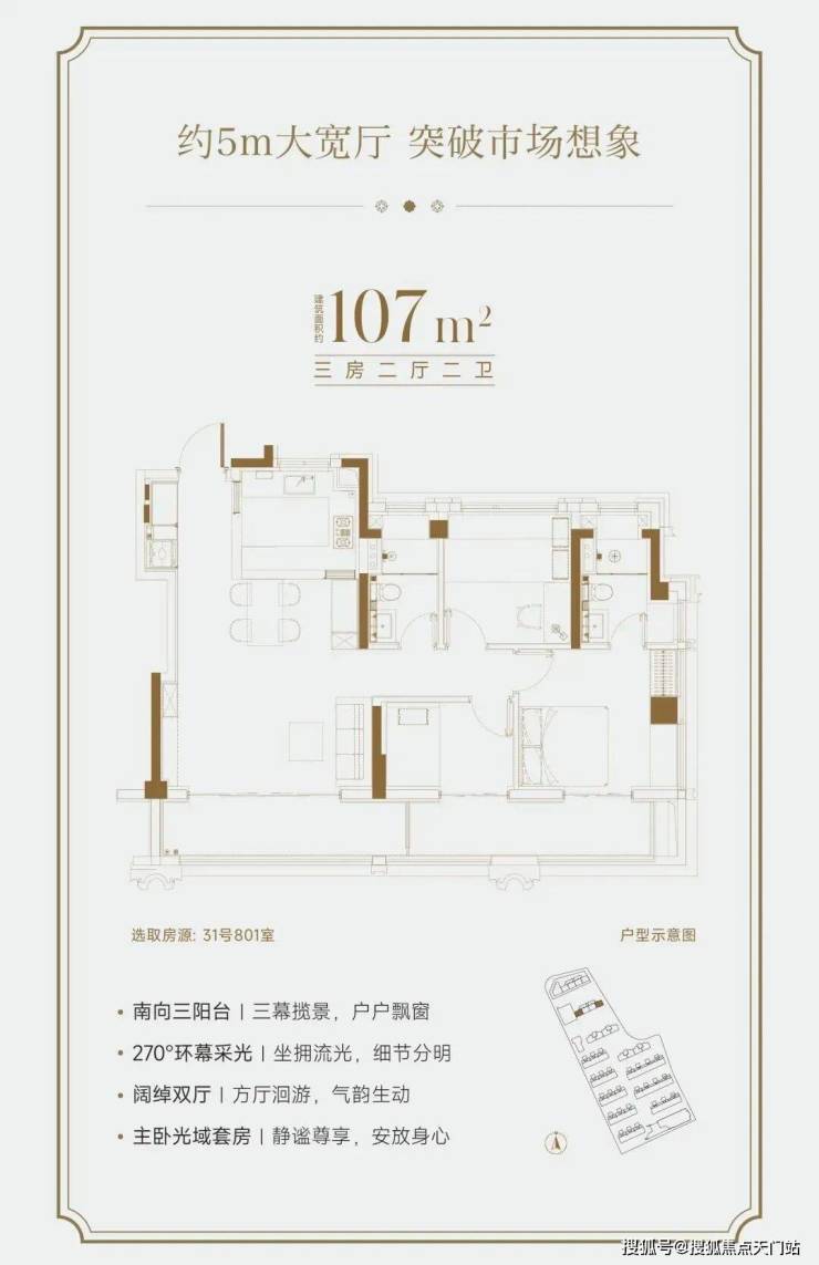 约107m²户型,赠送面积约15m²,实得率约96% ,于紧凑面积中,实现罕见奢阔。完全可以满足三口之家或三代同堂年轻家庭居住!约5.0米南向大宽厅,连接约16㎡景观阳台,构成开阔的LDK一体化空间。