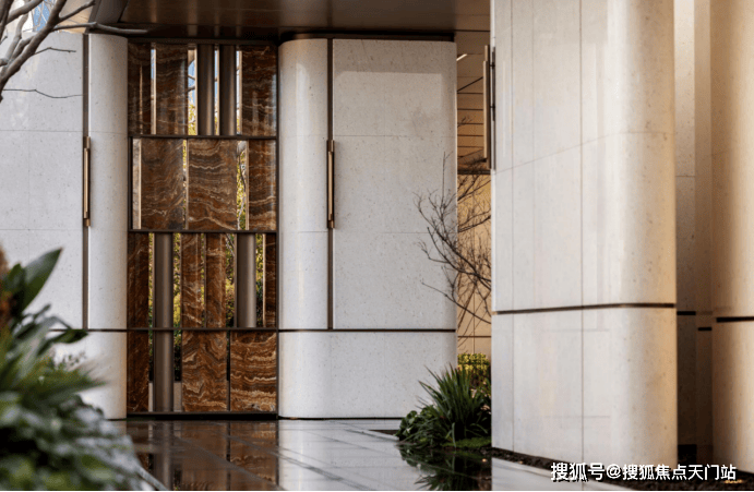 门庭延街的外立面,以精工定制弧形 米色石材 为主调,镶嵌典藏级 老虎玉大理石 ,点缀 古铜色现代海派艺术感灯器 ,整体呈现出百年海派的贵雅气质。