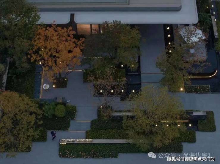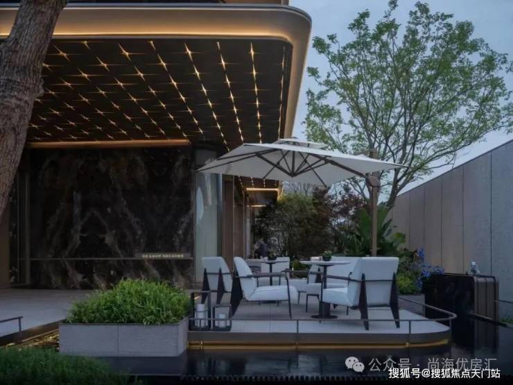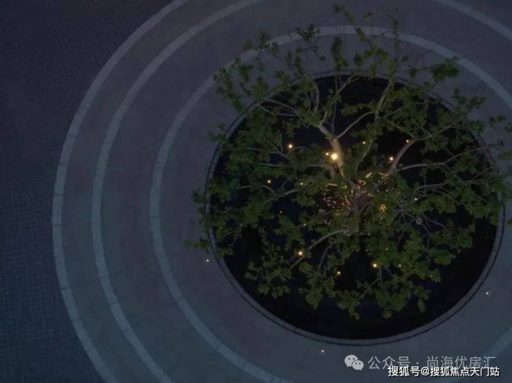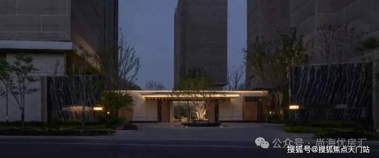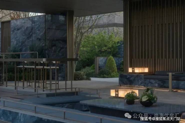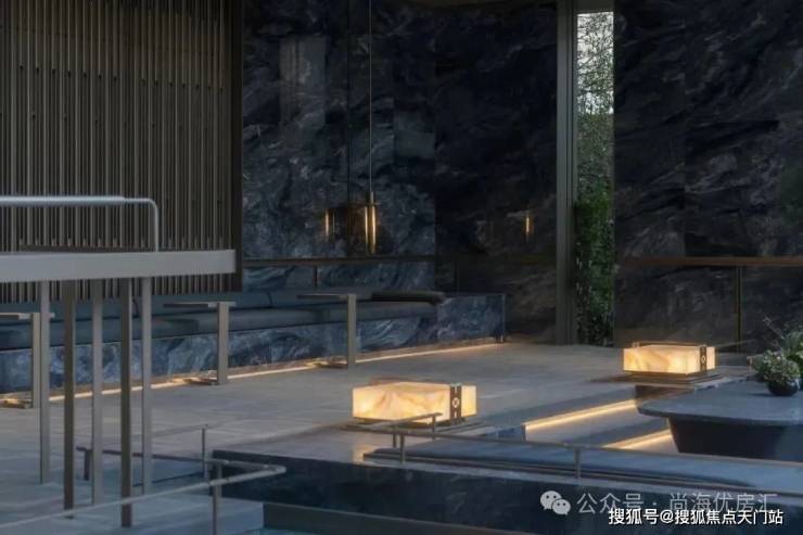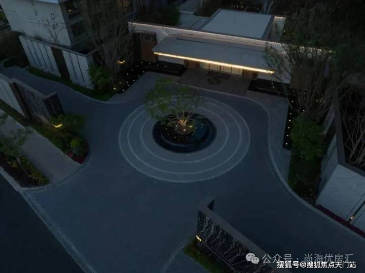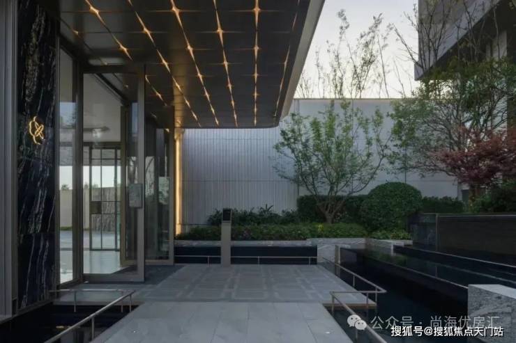 入口两边采用实体景墙与格栅形式,形成围合式院落空间,景墙前端采用奢石与金属点缀,墙面使用照壁灯有序排列,尽显奢侈度假风范。两侧阵列植物绿化,营造迎宾仪式感,凸显品质与调性。 院落内部设计采用了酒店式下落客的设计手法,中心圆形水盘聚八方之财气,寓意财源风水。圆盘水景中间选用特选造型树点缀,营造浓郁的度假氛围。配备豪华酒店式落客区的大堂设计,实现业主尊贵的归家仪式。