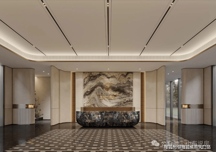 顶部香槟金造型 的异型 铝板 精致 典雅 ,搭配手工打磨的璀璨星空顶,仿若将银河纳入社区;地面仿石砖沉稳大气,与墙面汲取华尔道夫酒店精髓的浅米系大理石贴面相得益彰,营造出优雅静谧的氛围。