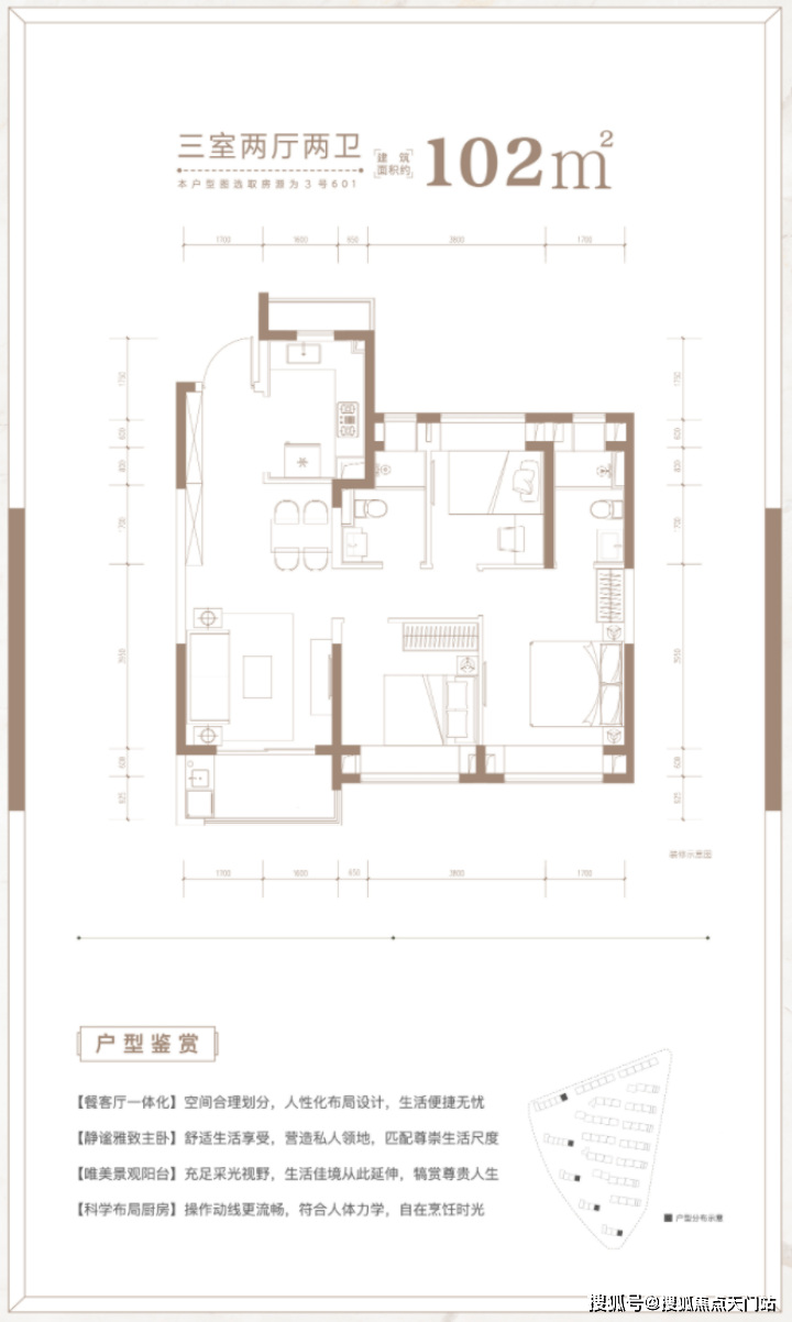 建面约102㎡3房2厅2卫户型,做到了三开间朝南+双朝南卧室带飘窗+动静分离+卫生间干湿分离,采光面拉到极致!是一个非常方正的户型。